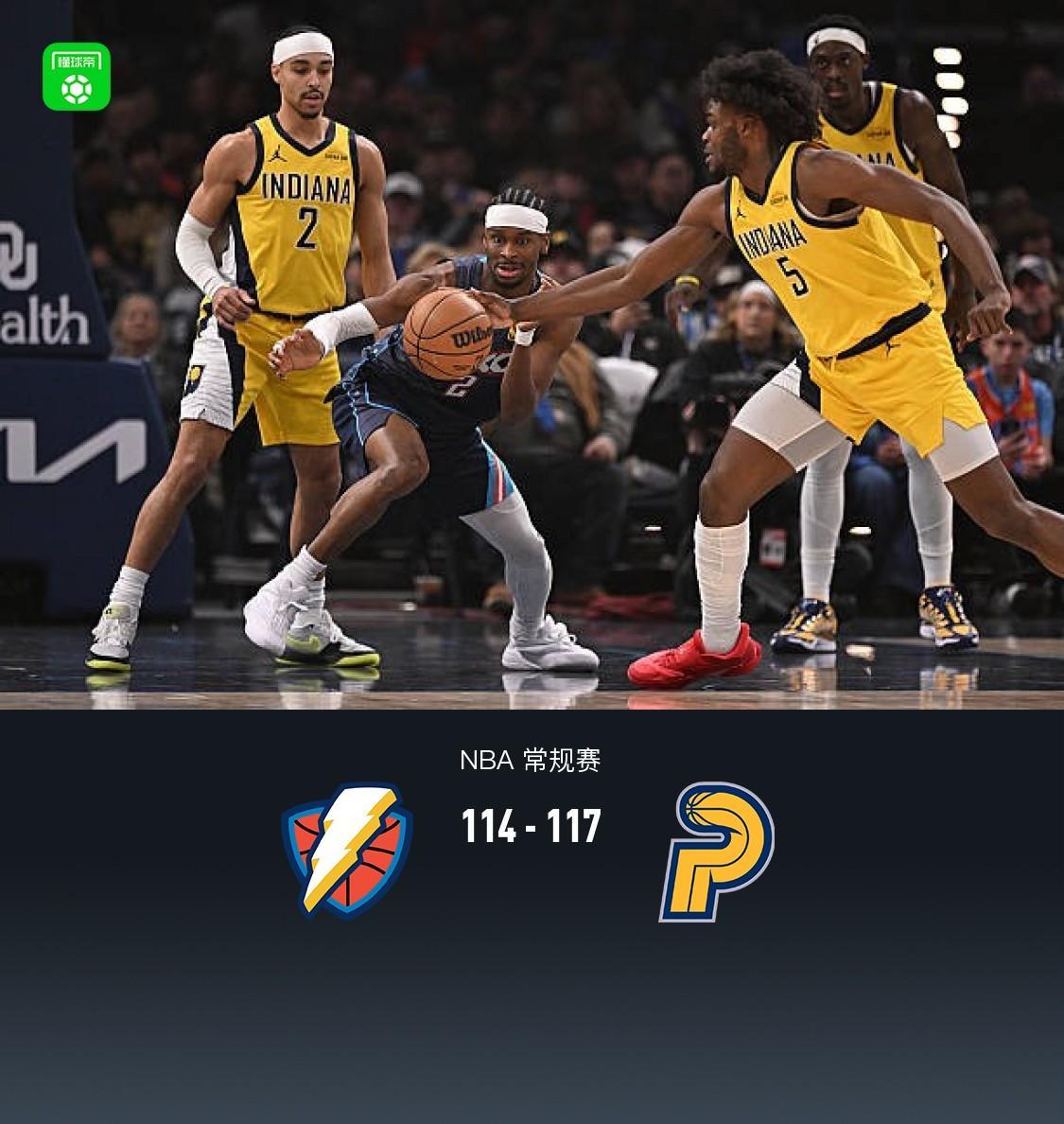 • 步行者客场117-114送雷霆赛季第9败,亚历山大空砍47分