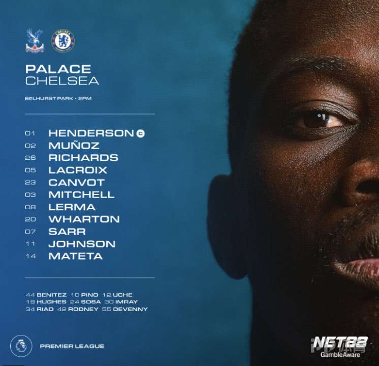 水晶宫首发:1-亨德森、23-康沃、3-米切尔、26-理查兹、5-拉克鲁瓦、2-穆尼奥斯、20-沃顿、8-莱尔马、11-约翰逊、7-萨尔、14-马特塔